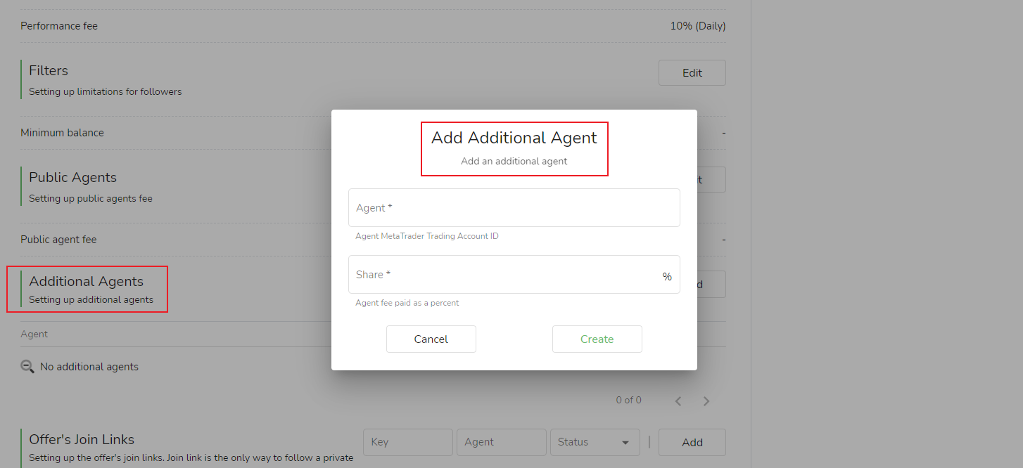 شركاء مصدر الإشارة:بالمقارنة مع المقدمة والترويج ، فإن شريك مصدر الإشارة لديه علاقة أوثق بمصدر الإشارة. يمكن إضافة مصدر الإشارة عن طريق النقر فوق [إضافة] ، ثم ملء حساب تداول MetaTrader لشريك مصدر الإشارة ، وتحديد رسوم شريك مصدر الإشارة بنسبة مئوية ، ثم النقر فوق [إنشاء] لإضافة شريك مصدر الإشارة.