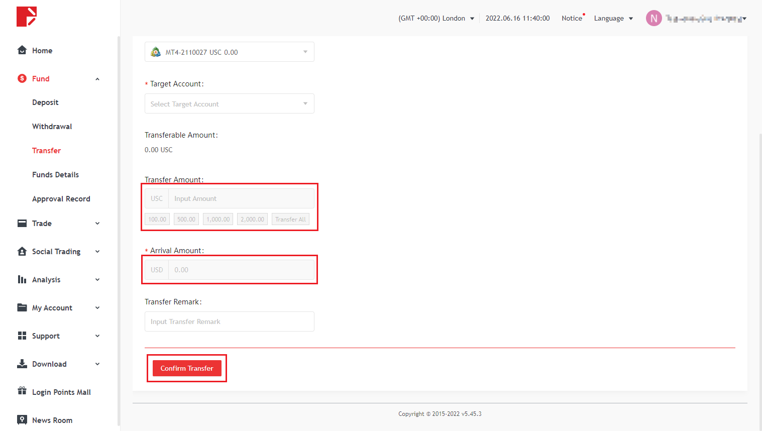 Select the transfer-out account and transfer-in account, enter the transfer amount, and click “Confirm Transfer”.