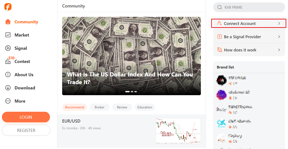 After the customer logs in to FOLLOWME, click "Connect Account" on the right side of the homepage and find D Prime on the Connect Trading Account page.