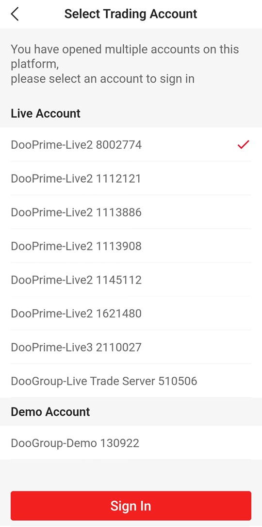 After that, select the real account or demo account you have opened according to your personal needs, and then click "Next" to start trading with D Prime InTrade.