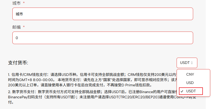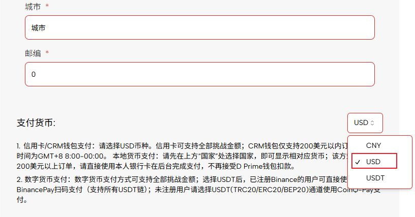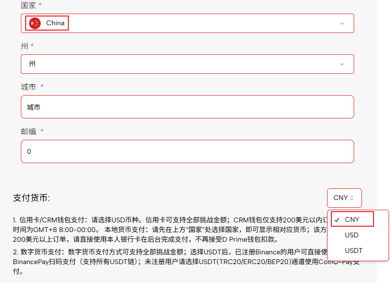 - En la página de pago "nación" Seleccione el país y el estado de la moneda en la que desea pagar y Moneda de pago Seleccione la moneda correspondiente en el menú desplegable (por ejemplo,Año Nuevo Chino).