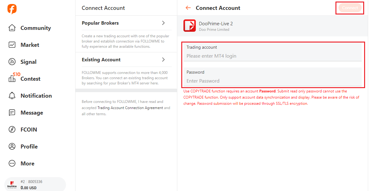 Como conectar uma conta de negociação D Prime via FOLLOWME?