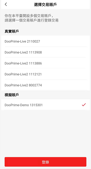 之后因应个人需求选择您已开设的真实账户或模拟账户,然后点击 ”下一步” 即可以 D Prime InTrade 进行交易。