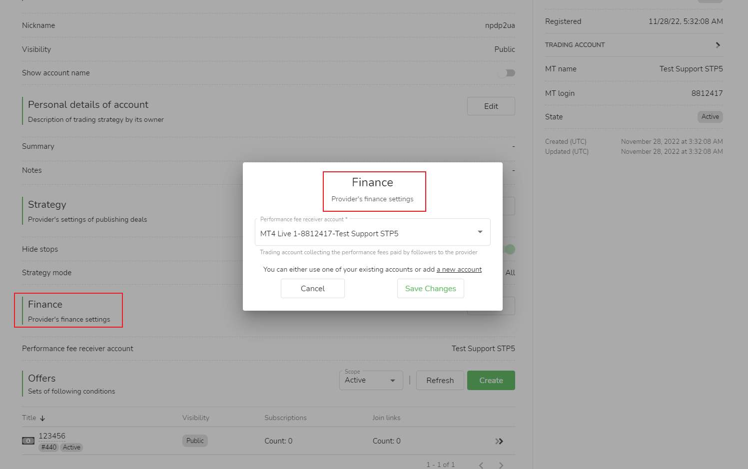Tài khoản chấp nhận phí hiệu suất:Tài khoản giao dịch mà nguồn tín hiệu thu thập người theo dõi để trả phí hiệu suất cho nguồn tín hiệu có thể chọn tài khoản hiện có hoặc thêm tài khoản mới. Trong quá trình thêm tài khoản mới, bạn cần điền vào tài khoản giao dịch (nghĩa là tài khoản giao dịch trong MetaTrader) và mật khẩu (nghĩa là Mật khẩu giao dịch MetaTrader) và sau đó nhấp vào [Lưu thay đổi] để hoàn tất cài đặt thành công.