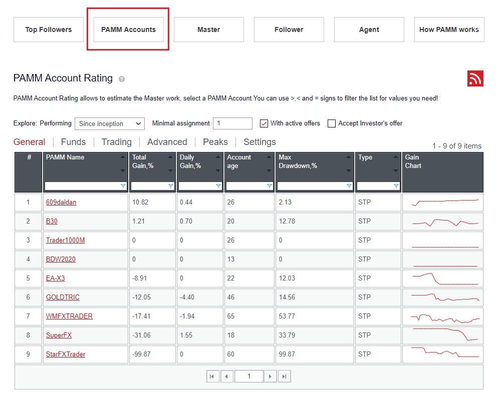 Để biết thêm thông tin và kết quả giao dịch về một bậc thầy, hãy nhấp vào tên PAMM của người đó để phân tích. Các thông số được chia thành năm nhóm: Chung, Cấp vốn, Giao dịch, Nâng cao, Đỉnh và Cài đặt. Người dùng có thể sắp xếp và áp dụng các bộ lọc trên bất kỳ cột nào.