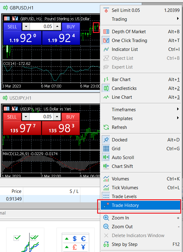 Nếu bạn không cần chức năng này, bạn có thể đóng nó theo cách sau: di chuột vào khoảng trống của biểu đồ, nhấp chuột phải và xóa [Lịch sử giao dịch] đã chọn: