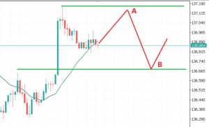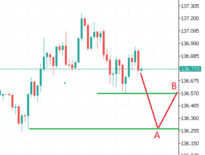b) Các nhà đầu tư kỳ vọng rằng USDJPY sẽ vượt qua ngưỡng kháng cự của đường A, sau đó phục hồi và giảm trở lại khi đường B bị chặn, do đó có thể sử dụng loại lệnh Giới hạn dừng bán;